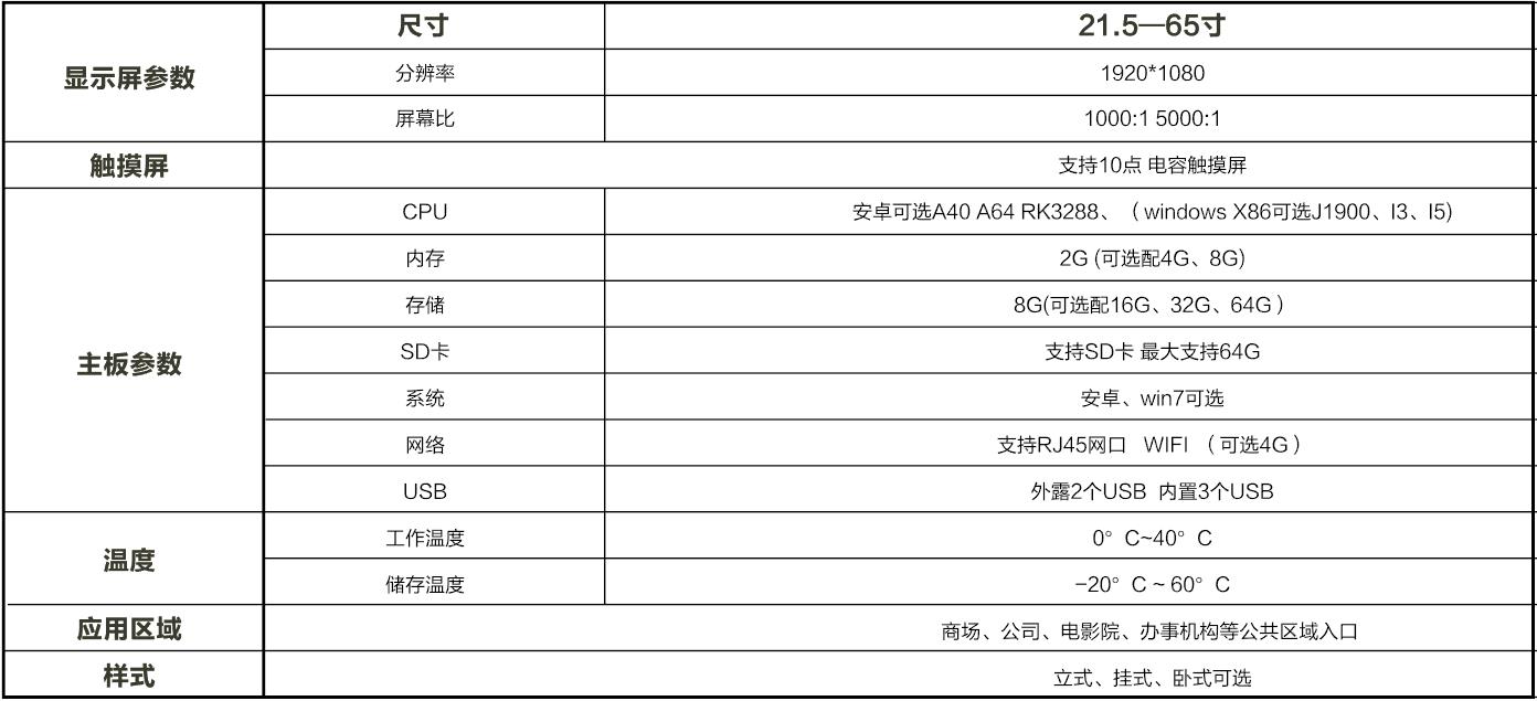超薄機身;質感拉絲金屬;高清畫質;觸摸極速反應;智能分屏;智能遠程信息發(fā)布;可定時開關機;提前設定節(jié)目源;鋼化玻璃屏幕;可定制專屬LOGO、多種顏色、尺寸可選。